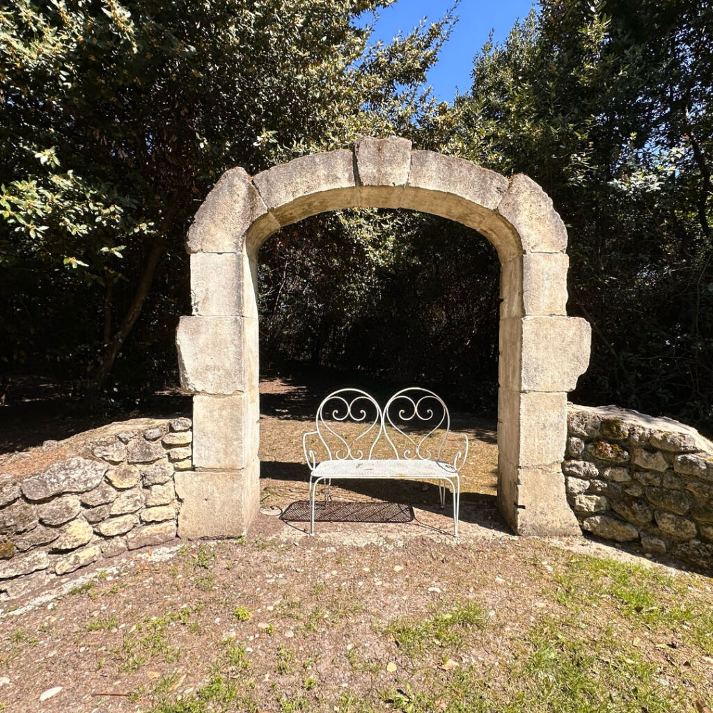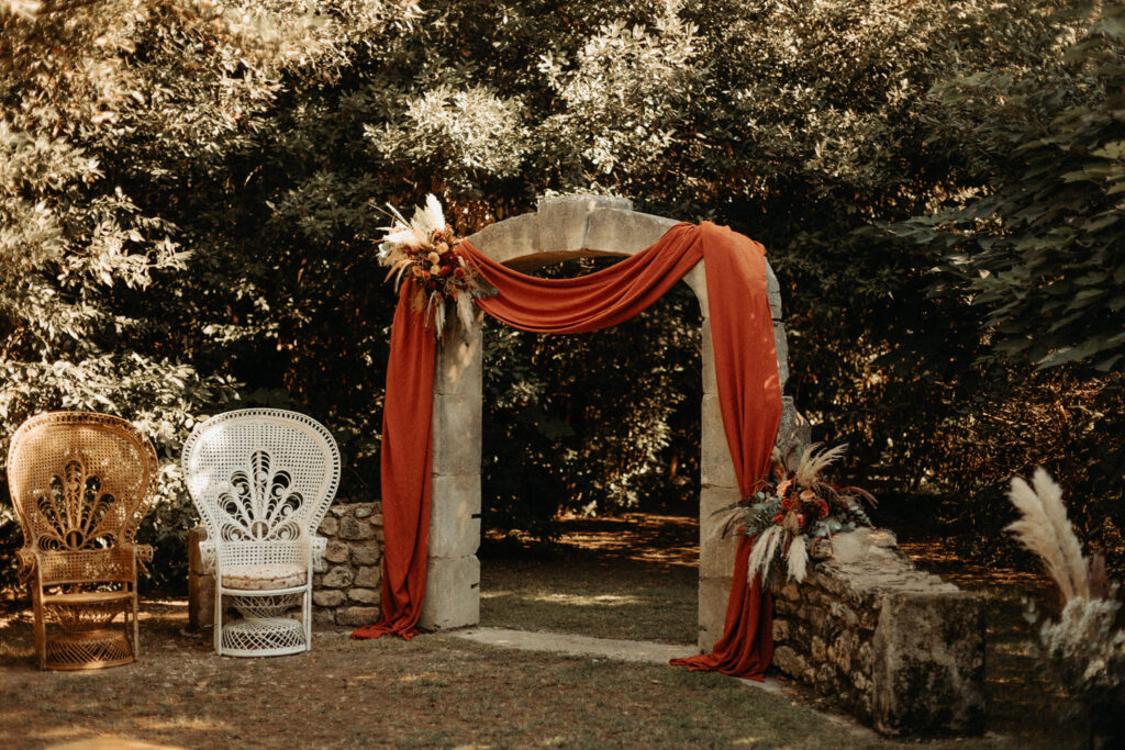 Lorsque vous arrivez dans notre espace dédié à la cérémonie laïque, vous sentez immédiatement que tout a été imaginé pour mettre en valeur ce moment si particulier. Une jolie arche en pierre domine l’endroit, sobre et élégante, comme un symbole intemporel face à votre engagement. La nature tout autour crée une atmosphère presque enveloppante. Les arbres forment une sorte de cocon végétal qui isole doucement la cérémonie du reste du monde.